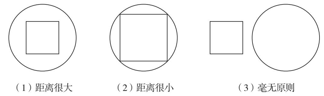 这是掌握外圆内方原则真正的关键问题。圆与方的关系有三种情况(具体如图3-1所示):一种是二者之间距离很大;一种是距离很小;还有一种,圆根本就是偏到旁边,这种状态就叫作毫无原则,因为虽然有原则,但是没有跟进,这种情况我们用四个字来形容,叫作“离经叛道”。