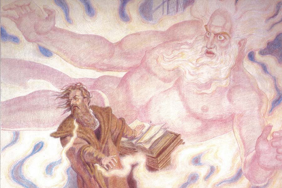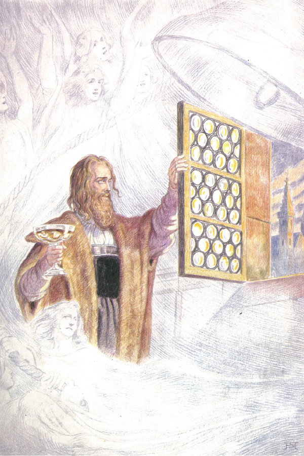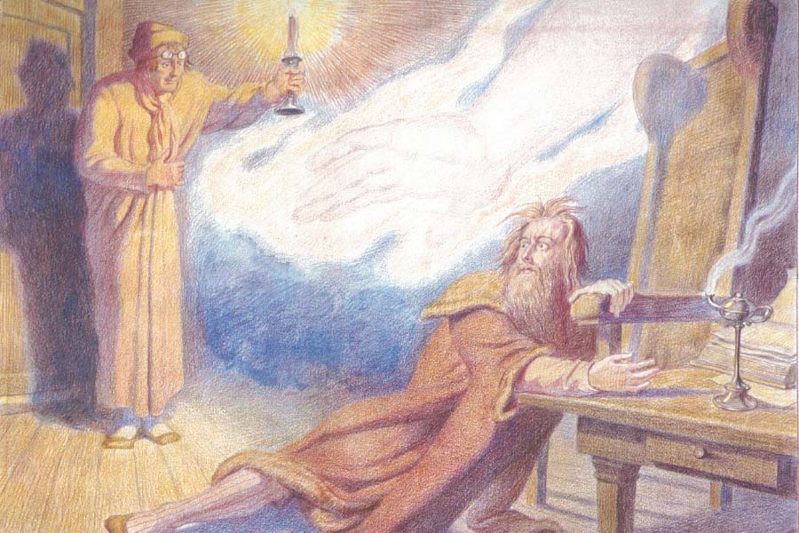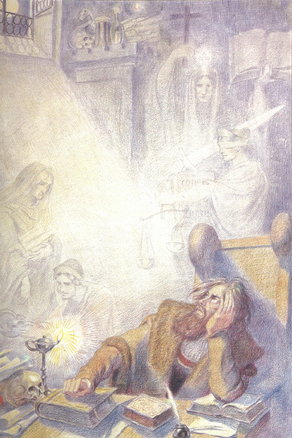 浮士德不安地坐在书案旁的靠椅上。