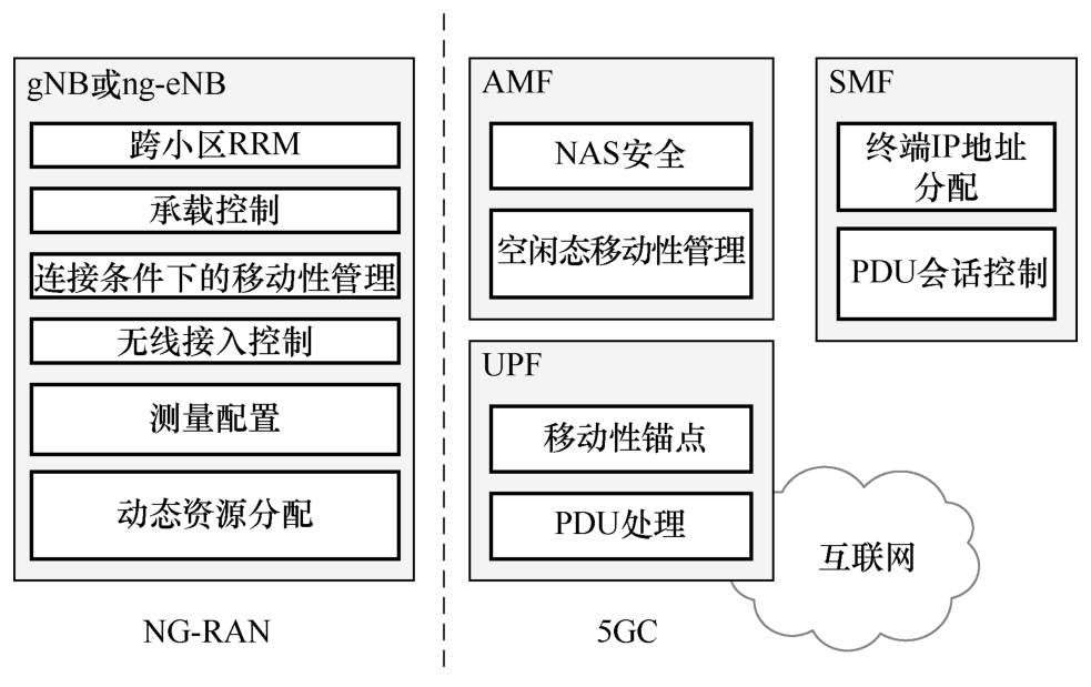 而核心网功能主要分配在三个节点中,包括移动性管理功能(AMF)、用户面功能(UPF)与会话管理功能(Session Management Function,SMF)。其中,AMF主要包括: