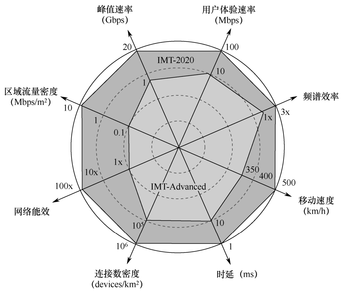 图2-2 IMT-2020(5G)与IMT-Advanced(4G)关键能力比较 [3]