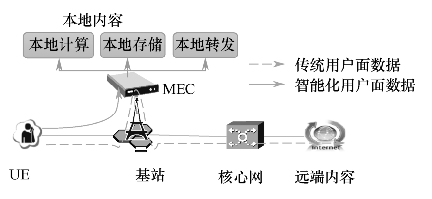随着人工智能和大数据技术的不断发展,计算能力成为垂直行业应用中非常重要的一种能力,所以传统的单一的通信连接能力已经不能满足很多垂直行业应用的需求,移动边缘计算(MEC) [9] 应运而生。MEC将计算、存储和转发等功能引入移动网络的边缘(可以是单独的网元,也可以和无线基站合设),实现智能的用户面功能。MEC原理如图2-7所示。