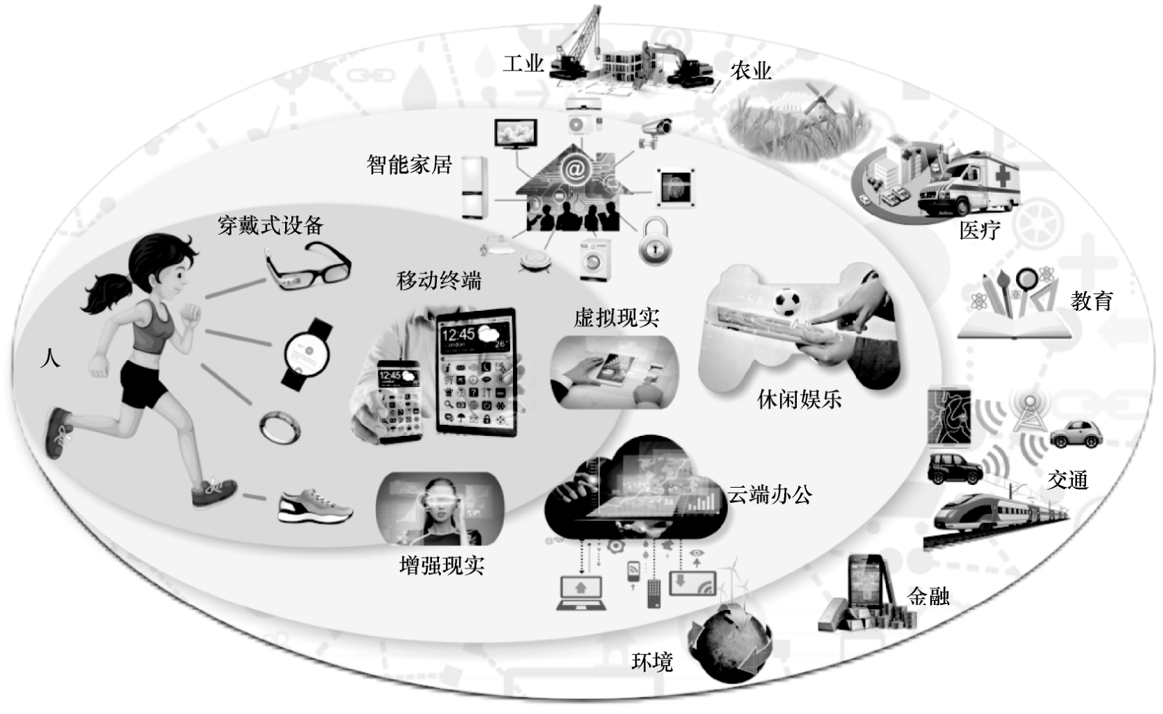随着移动互联网业务的飞速发展,为了应对未来爆炸性的移动数据流量增长、海量的设备连接的挑战,以及适配不断涌现的各类新业务的技术需求,第五代移动通信系统(5G)应运而生。面向5G,移动通信产业希望能够将4G带给移动互联网的繁荣复制到社会的各行各业,所以提出了万物互联的发展目标,不仅考虑人与人之间的连接,同时也考虑人与物、物与物之间的连接。所以,5G将渗透到未来社会的各个领域,构建“以用户为中心”的全方位信息生态系统,为用户带来身临其境的信息盛宴,便捷地实现人与万物的智能互联,最终实现“信息随心至,万物触手及”的愿景 [1] ,如图2-1所示。