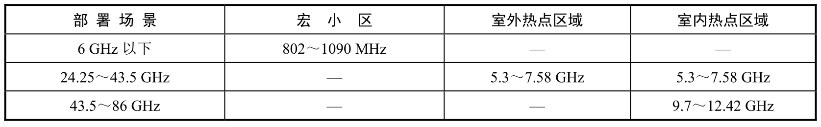 根据ITU的预测,5G不同场景的频谱需求估算结果如表2-2所示。6GHz以下低中频段主要用于满足5G宏小区连续覆盖的需求,其频谱需求为802~1090MHz。高频段主要用于满足5G室内和室外的热点容量需求。
