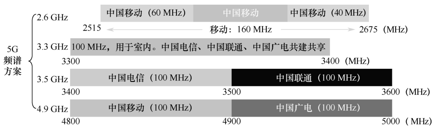 根据IMT-2020推进组2014年发布的《5G愿景和需求白皮书》 [1] ,预计我国2010—2020年移动数据流量将增长300倍以上,2010—2030年将增长超4万倍。发达城市及热点地区的移动数据流量增速更快,2010—2020年上海的增长率可达600倍,北京热点区域的增长率可达1000倍,这对我国未来频谱资源的需求提出了更大的挑战。2018年年底,工业和信息化部出台5G频率分配方案:中国电信和中国联通分别获得3.4~3.5GHz和3.5~3.6GHz的100MHz频率,中国移动获得2.515~2.575GHz和2.635~2.675GHz的非连续100MHz频率,以及4.8~4.9GHz频率;中国广电、中国电信和中国联通分别获得3.4~3.6GHz的各100MHz连续频率;中国广电获得移动牌照,其700MHz的30MHz×2FDD频率(上行703~733MHz,下行758~788MHz)可用于5G,同时获得4900~4960MHz的TDD频谱。我国的频率分配方案充分保证了每个运营商100MHz(中国移动通过4G网络的频谱搬移)的连续带宽,为建设一张优质和领先的5G网络奠定基础,在结合中国电信和中国联通的共建共享以及中国移动和中国广电的共建共享,较好地取得了5G部署成本和发展速度之间的折中,为后续中国5G网络发展的全球领先奠定了很好的基础。中国的5G新频率分配方案如图2-10所示。