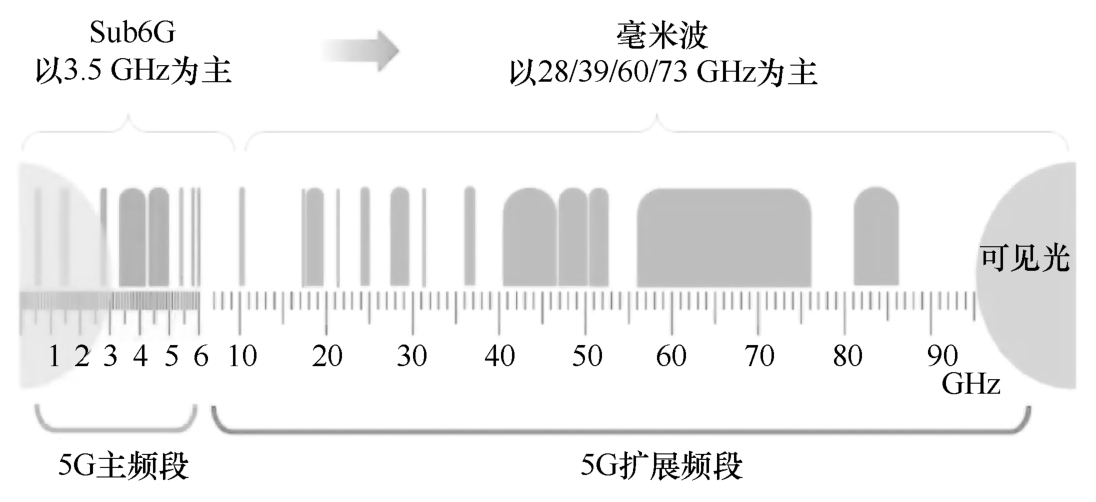 低、中、高频段联合组网是未来5G广覆盖、高容量的基本频谱策略,其中低频段由于其良好的空间传播特性,可以用于解决覆盖问题。目前,我国1GHz以下低频段较少,无法满足5G对大带宽、高容量的需求;但低频段覆盖能力较好,可有效保证传输可靠性的要求。6GHz以下中频段具有较好的空间传播特性以及较大带宽,若结合低频段,则可有效兼顾覆盖与容量需求。相比于低、中频段,5G高频段(>24.25GHz)的毫米波更易获得连续超大带宽,是实现高传输速率的重要基础。