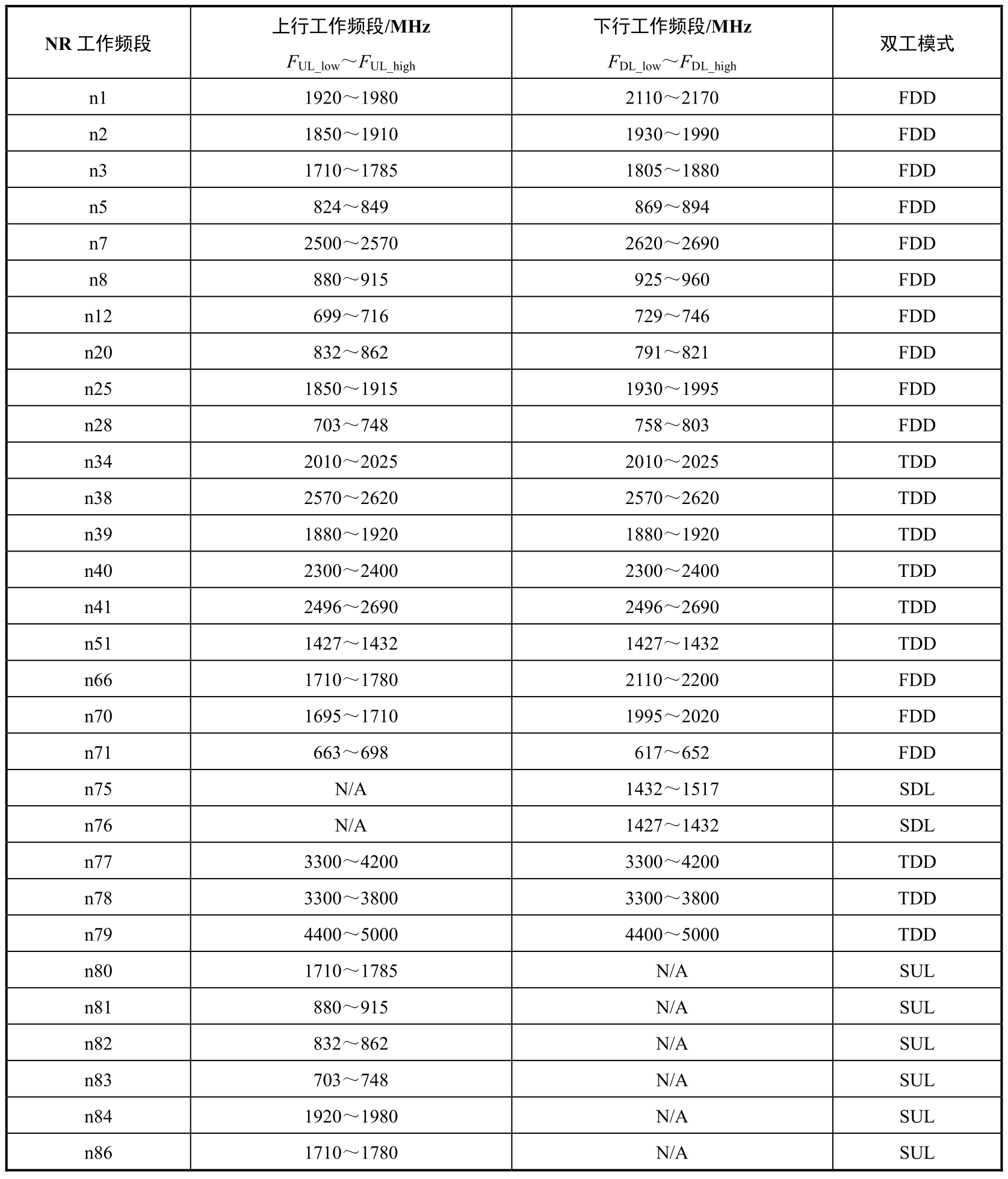 3GPP标准将5G可用频率分为频率范围1(Frequency Range 1,FR1)和频率范围2(Frequency Range 2,FR2),其中FR1包括450~7125MHz;FR2包括24.25~52.6GHz的毫米波频段。3GPP标准对频段进行了区分,其中对于LTE重耕频段,NR频段号是在LTE频段号之前加前缀n,如国内TD-LTE使用的频段41,在NR中变更为n41,但具体工作频段范围不变。3GPP中FR1频段定义如表2-3所示,FR2频段定义如表2-4所示。