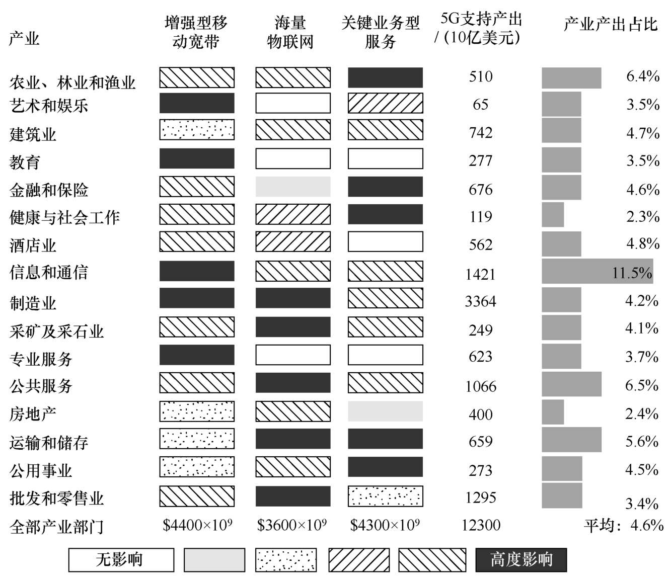 “信息随心至,万物触手及”为我们描绘了2020年以后的美好愿景,也预示着5G将给未来社会带来巨大的变化。围绕网络强国建设、“互联网+”、制造强国建设等一系列国家战略,我国也对5G的发展设计了宏伟的蓝图。4G带来了移动互联网应用的空前繁荣,拉开了数字经济发展的序幕,我们更希望5G能够把类似的繁荣带给社会的各行各业,实现赋能千行百业,促进整个社会的数字化转型升级。不仅仅中国,全球其他主要经济体都对5G的发展寄予了厚望,都希望借助5G抢占新一轮经济发展的先机。HIS Markit预测了2035年5G对驱动各行业产出增长的贡献,如图2-11所示,其中关键业务型服务指的是5G将支持高可靠性、超低时延连接以及高安全性和可用性的应用。可以看出,5G的出现将对各行各业带来巨大影响。据HIS Markit预测,到2035年,5G在全球驱动各行业产出增长将达12.3万亿美元,约占2035年全球实际总产出的4.6%。