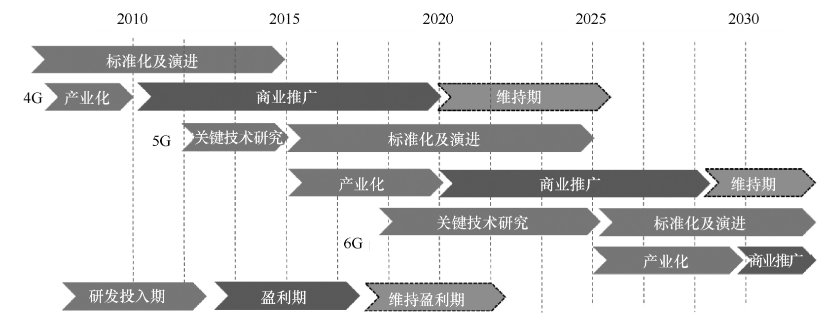 在新一代移动通信系统的整个发展过程中,关键技术研究、标准化和产业化都需要全产业的巨大投入,而产业仅在商业应用推广的阶段才能取得回报,运营商的商业变现越成功,其网络建设规模越大,供应商则收入越高。所以,在整个新一代移动通信系统的研发投入期,产业的发展需要过去一代甚至多代移动通信系统的持续收入来支撑,才能保证新一代移动通信技术研发的可持续性。移动通信系统的研发周期解析如图3-1所示。