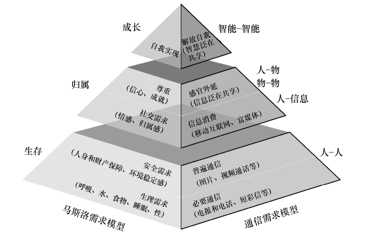 “马斯洛需求模型”将人的需求分成五个层次,受其启发,中国移动将其演化到通信需求的层面,提出一种层次化的通信需求模型,分为五个等级:必要通信、普遍通信、信息消费、感官外延、解放自我 [2] ,如图3-2所示。在该模型中,通信需求和通信系统构成了螺旋上升的循环关系:需求的出现刺激了通信技术和通信系统的发展,而通信系统的完善将通信需求推向更高的层次,最终帮助人类解放自我,实现人类智能化的终极追求 [2] 。