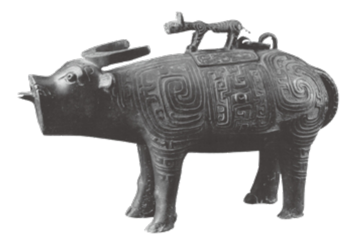 陕西省宝鸡市岐山县贺家村则出土了一件西周时期的青铜牛尊(图2-13),也是当时贵族的酒器。此牛尊整体呈伫立状,双眼圆睁,耳朵斜出,双角向后飞起,牛头翘首、引颈,作吼叫状。牛躯浑圆,四腿粗壮。牛舌伸出,为流;尾向下卷成半环状,为鋬。牛背开方口并置盖,盖面上铸虎钮,虎呈站立状,昂首、竖耳、扬尾,长脊下压,四腿发达有力,身体微微后缩,作势欲扑。牛尊通体饰抽象的涡云纹和变相鸟纹,腹、背及足部饰云纹和夔龙纹。