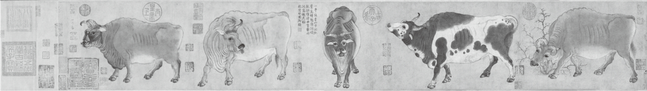 若论绘画中的牛,当属唐代韩滉画的《五牛图》为佳(图2-16)。韩滉活跃于唐德宗时期,尤其擅长画人物和畜兽,其中以画牛最为精妙。据研究者考证,《五牛图》画了五头神态、性格、年龄各异的牛。韩滉用粗壮有力的墨线勾勒牛的轮廓,表现出牛的强健、沉稳,对牛的眼睛、鼻子、蹄趾、毛须等部位均着意渲染,凸显出牛有力劲健的筋骨和质感真实的皮毛。宋末元初著名画家赵孟頫认为《五牛图》中的“五牛神气磊落,稀世名笔也”,并在《五牛图》上作了题记。《五牛图》与清代圆明园的十二兽首类似,在1900年八国联军洗劫紫禁城之际,被掠夺并流失国外。直到20世纪50年代初,《五牛图》才得以回归祖国,现藏于故宫博物院。