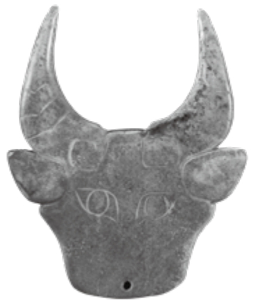 除了青铜器,西周时期的虢国墓地出土的玉牛面(图2-14)也值得关注。这件文物玉料浅黄,整体呈片状,雕刻了牛头的正面,双角对称竖起,双耳斜向伸出,双眼呈“臣”字形,没有刻画出牛鼻,嘴巴处有一圆孔。