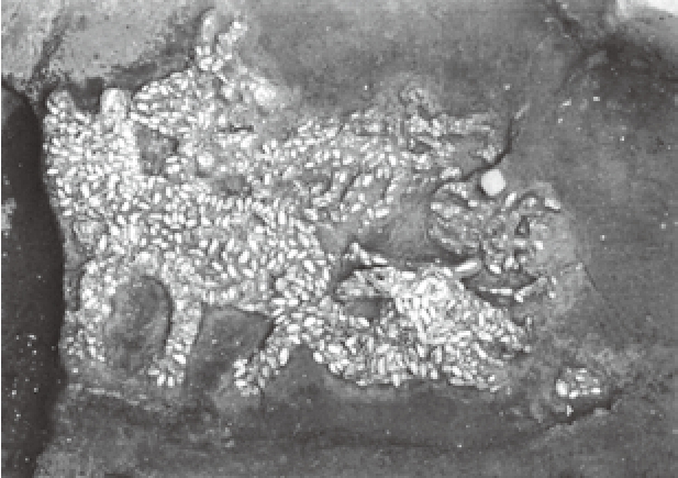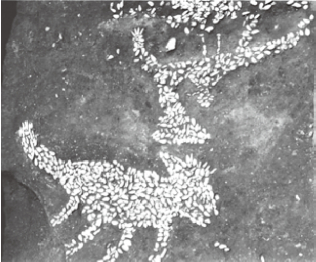 尽管老虎的骨骼残缺不全,但是有些与老虎相关的人工遗迹还是给人留下了深刻的印象。在考古发掘中发现的与老虎相关的人工遗迹中,最著名的当属西水坡遗址(位于河南省濮阳市,属于新石器时代)的蚌壳摆塑龙虎图案。在这个遗址属于仰韶文化第二阶段(距今约6500—6300年)的文化遗存中,考古人员发现了三组跟龙虎相关的蚌壳摆塑图案。如45号墓的墓主人其左右两侧各有蚌壳摆塑的一龙一虎图。其中,老虎图案位于墓主左侧,头朝北、背朝东,身长1.39米,虎头微低,眼睛圆睁,张口露齿,四肢呈行走状,尾巴下垂(图3-1)。在45号墓正南20米处,还发现一组蚌壳摆塑的龙虎连体图。虎头朝北、面朝西、背向东,虎尾与龙的上半身相连,虎背上有一似鹿动物(图3-2)。在龙虎连体图正南约25米处又发现一组蚌塑人骑龙和奔虎图案。其中,虎头朝西、背向南,仰首翘尾,四肢微屈,呈奔跑状(图3-3)。