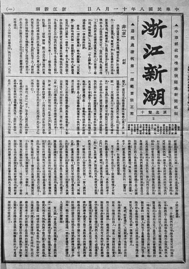 两期过后,《双十》办刊的队伍扩大了。大家觉得这个名字不能直抒胸臆,半个月的刊期也太长,于是在俞秀松提议下改作《浙江新潮》,每周一刊,4开4版,铅印。各校学生轮流编辑,第1期为甲工学校,第2期为第一中学,第3期为施存统。