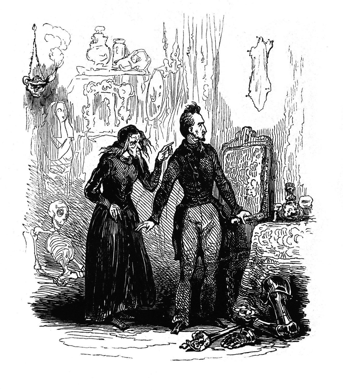 皇帝雕像被一只水龙戳瞎了眼睛。几幅大革命前的法国市政长官和荷兰市长的肖像画就挂在这堆乱七八糟的古玩之上。画中的人神情冷漠,想必在世时也是如此,他们以冷淡无情的目光投向周围。全世界的国家似乎都把他们做实验剩下的残渣和艺术样品送到这里来了。这里就像是哲学的堆肥,里面什么都有,有印第安野蛮人的烟斗,有奥斯曼帝国宫廷中穿的绿色和金色的软鞋,有摩尔人的弯刀,还有鞑靼人崇拜的偶像,甚至还有士兵的烟袋、教士的圣体盒以及王座上的羽毛。变幻莫测的光线,尖锐的明暗对比,和不拘一格混合出的种种色调,使得这光怪陆离的画面更加古怪。这感觉就像是,耳边响起了断续的叫喊,脑中浮现了未完的剧目,眼中见到了无法掩盖的火光。最后,一层难以清扫的薄灰像纱一般覆盖了所有物件,凸显出它们那众多的棱角和复杂的线条,使画面更加奇特。商店有三个厅,堆满了凝结着文明、宗教、神权、艺术、皇权、人欲的物品,或是闪耀理性,或是表现疯狂。青年人先是觉得这三个厅就像个多面镜,每张镜面都映射出不同的世界。有了大致的印象后,他准备挑选自己喜欢的好好看看。然而就在他不断观察、思考和畅想时,他竟然因无力发起了烧,或许是因为太饿了,他的肚子已经咕咕作响。