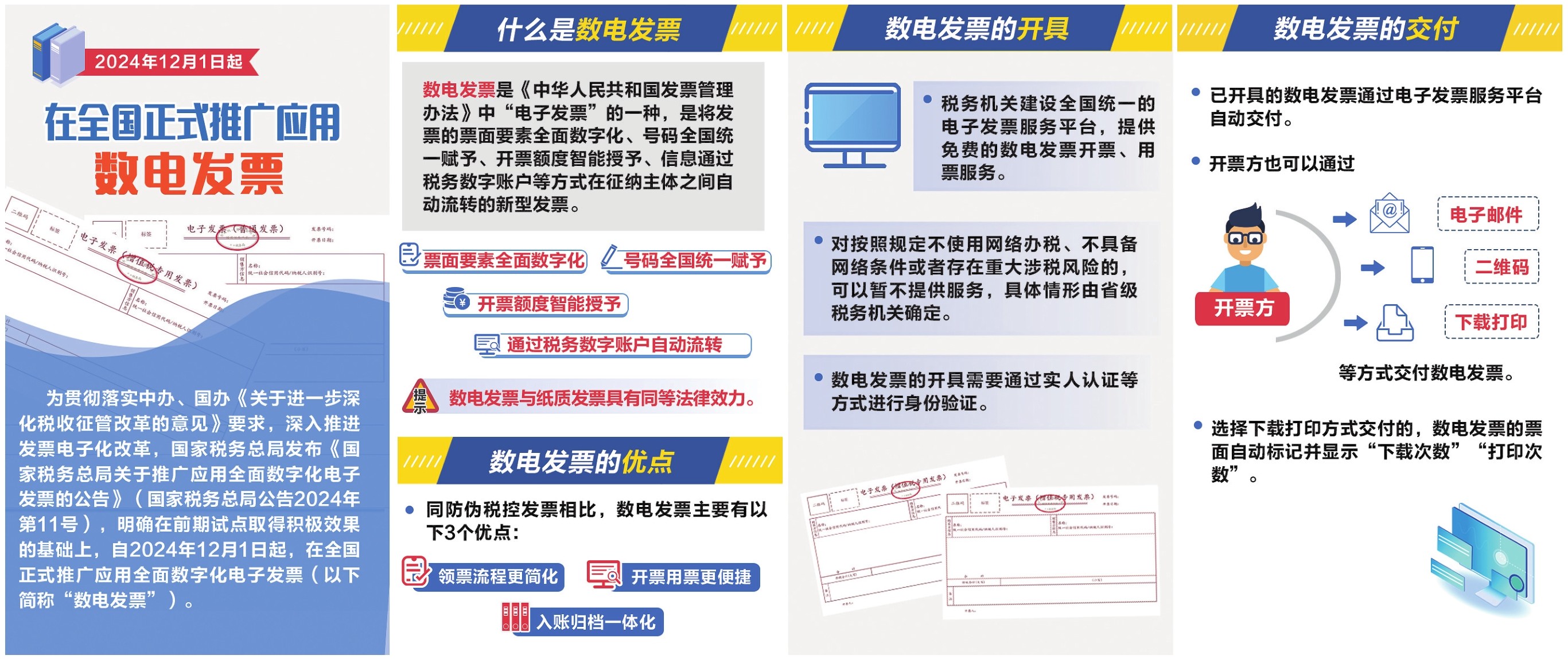本报讯 (记者 徐沙浓 ) 11月24日,国家税务总局发布《关于推广应用全面数字化电子发票的公告》。公告明确,自2024年12月1日起,在全国正式推广应用数电发票。
