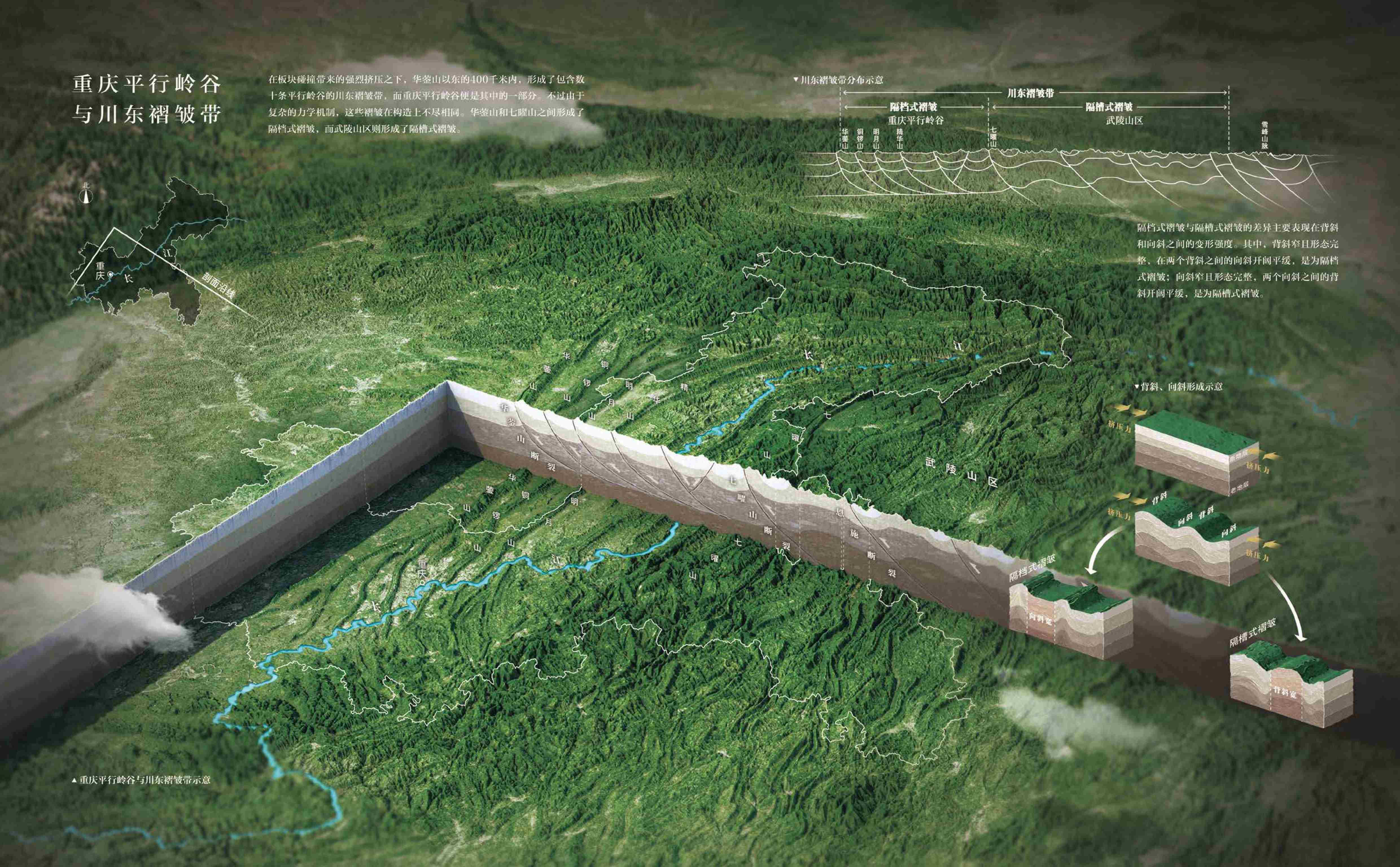 板块碰撞造成的影响远不止于此。在重庆内部,一道道褶皱随地就势,逐渐成形。