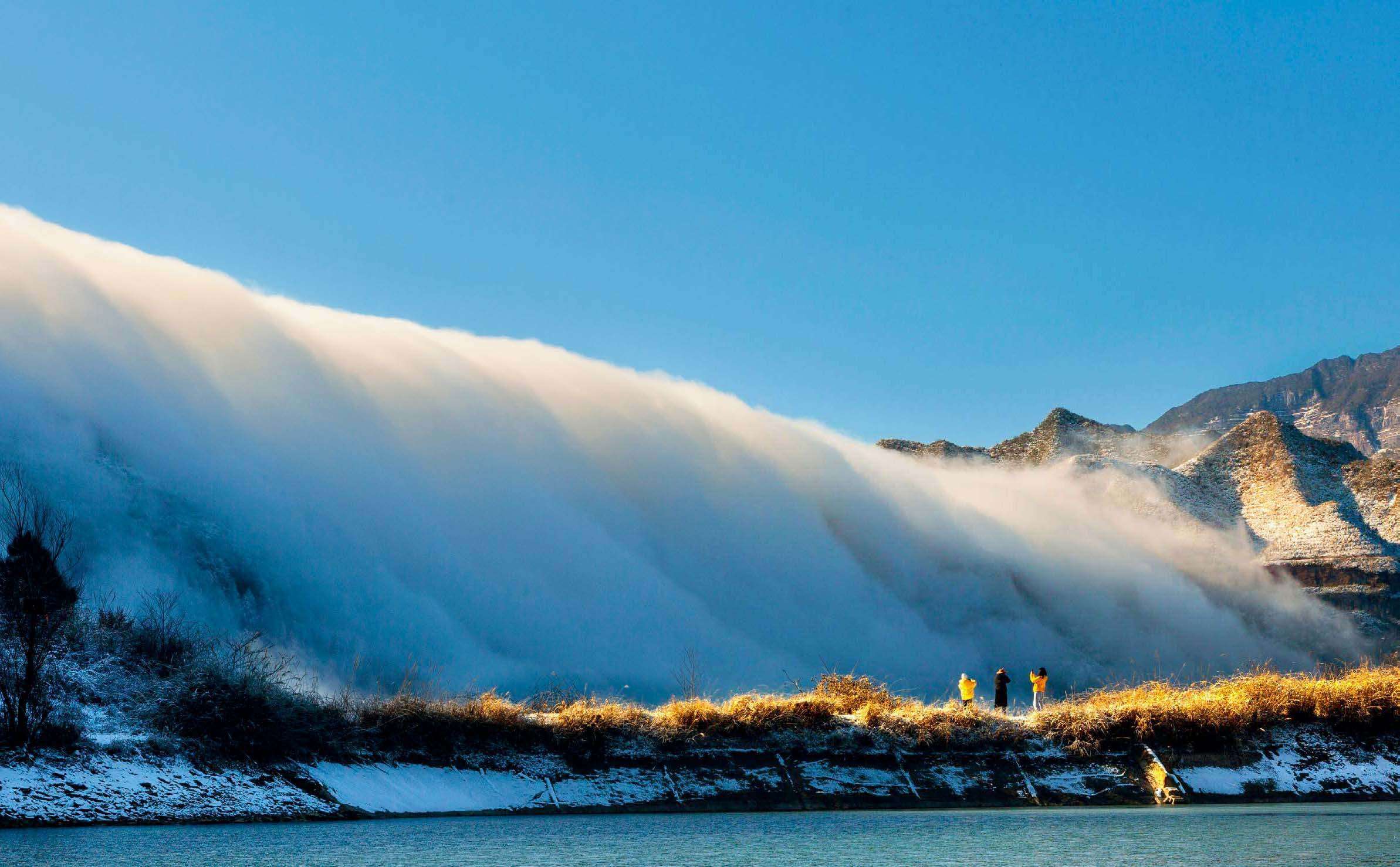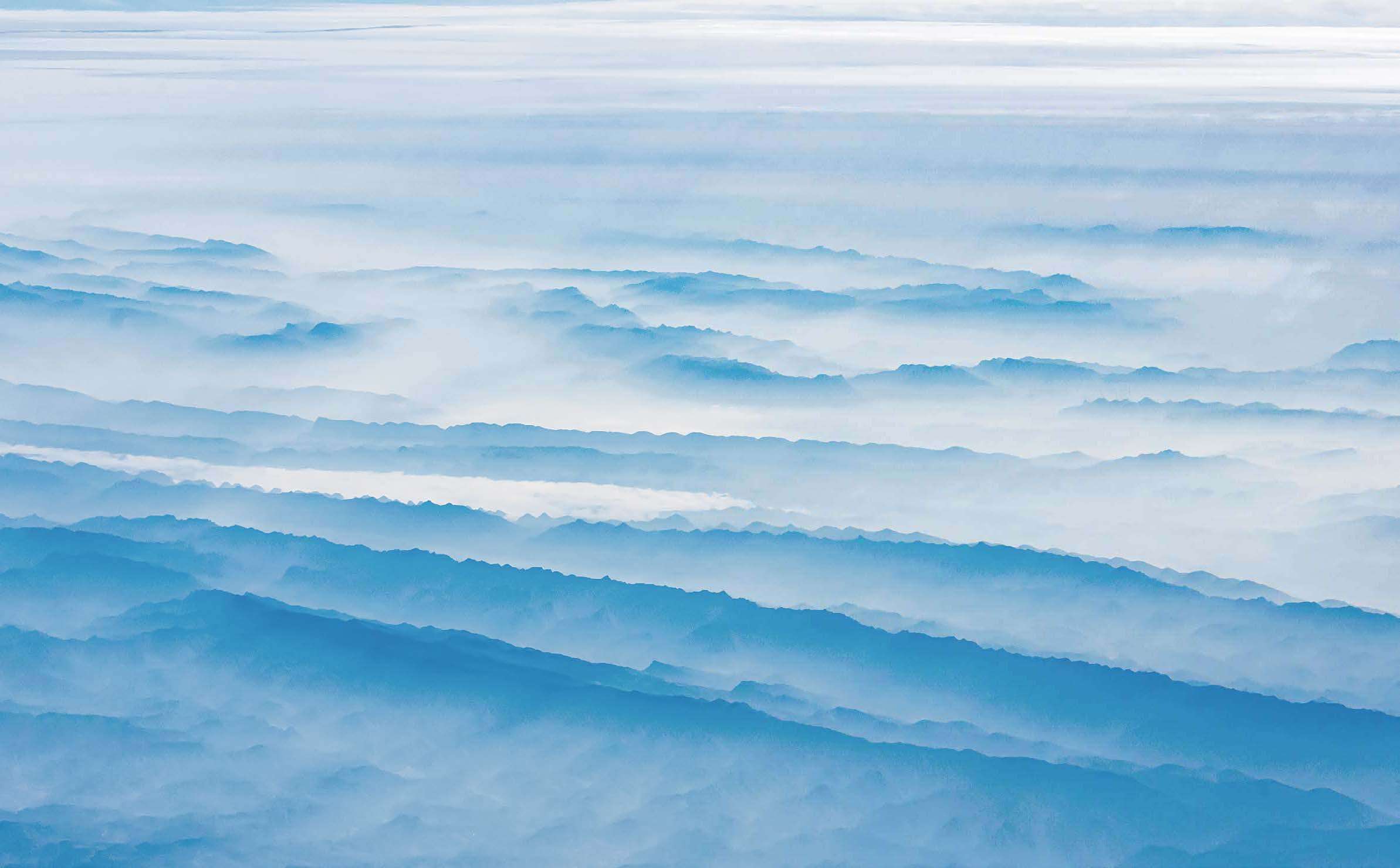 图中的平行岭谷走向一致,起伏连绵,在云雾之中,绘成一幅大地水墨画。