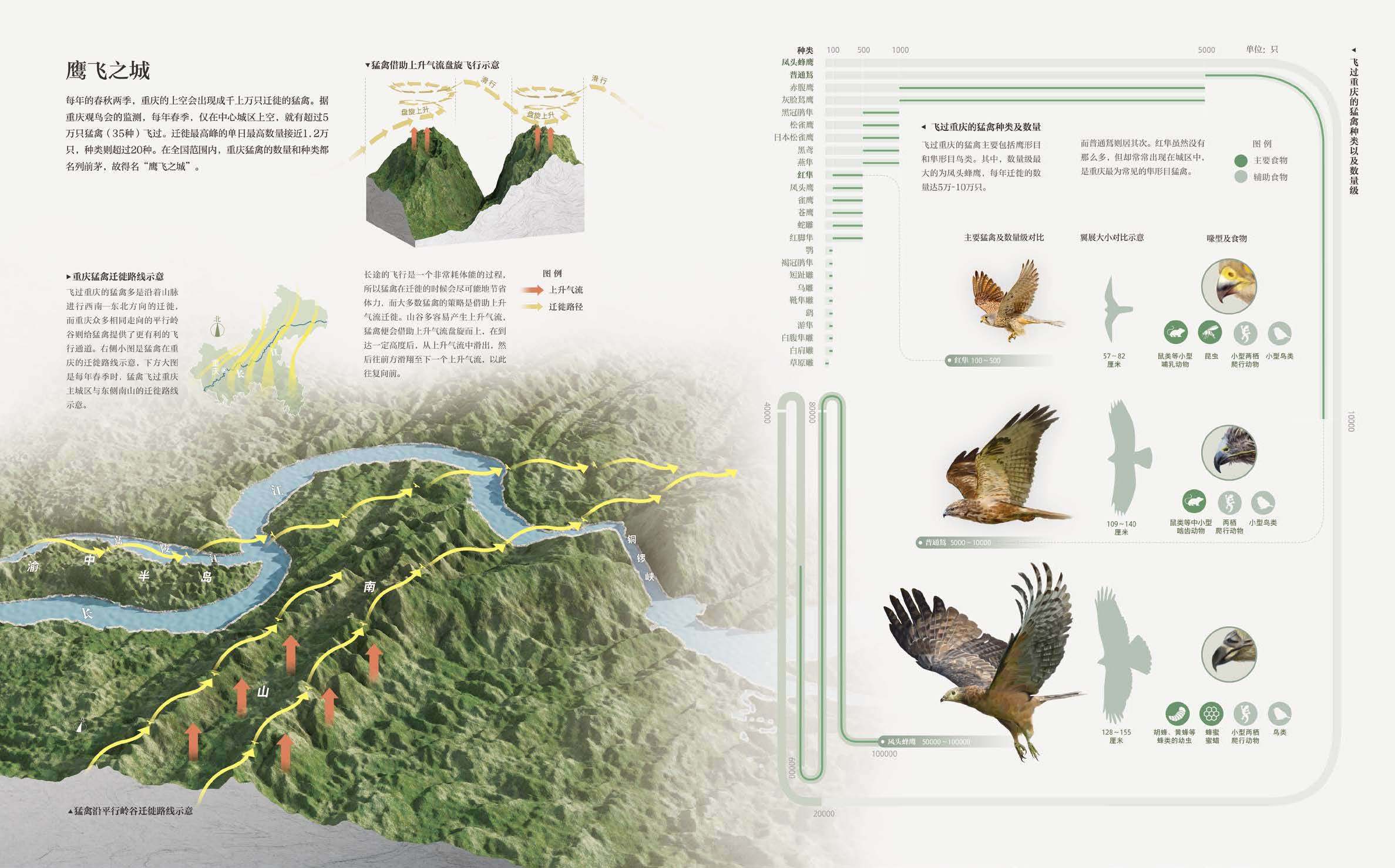 山脉将重庆内部原本平整的大地从中隔开,让东西方向的联系变得艰难,却也为一类特殊的物种——猛禽提供了一条条南北向的迁徙通道。每年春秋季节,包括凤头蜂鹰、普通鵟(kuáng)、赤腹鹰、灰脸鵟鹰在内的数十种共十余万只猛禽,借助平行岭谷这一特殊地形生成的气流进行南北向的迁徙,构成一条“猛禽迁徙高速路”,平行岭谷中的重庆也因此得名“鹰飞之城”。