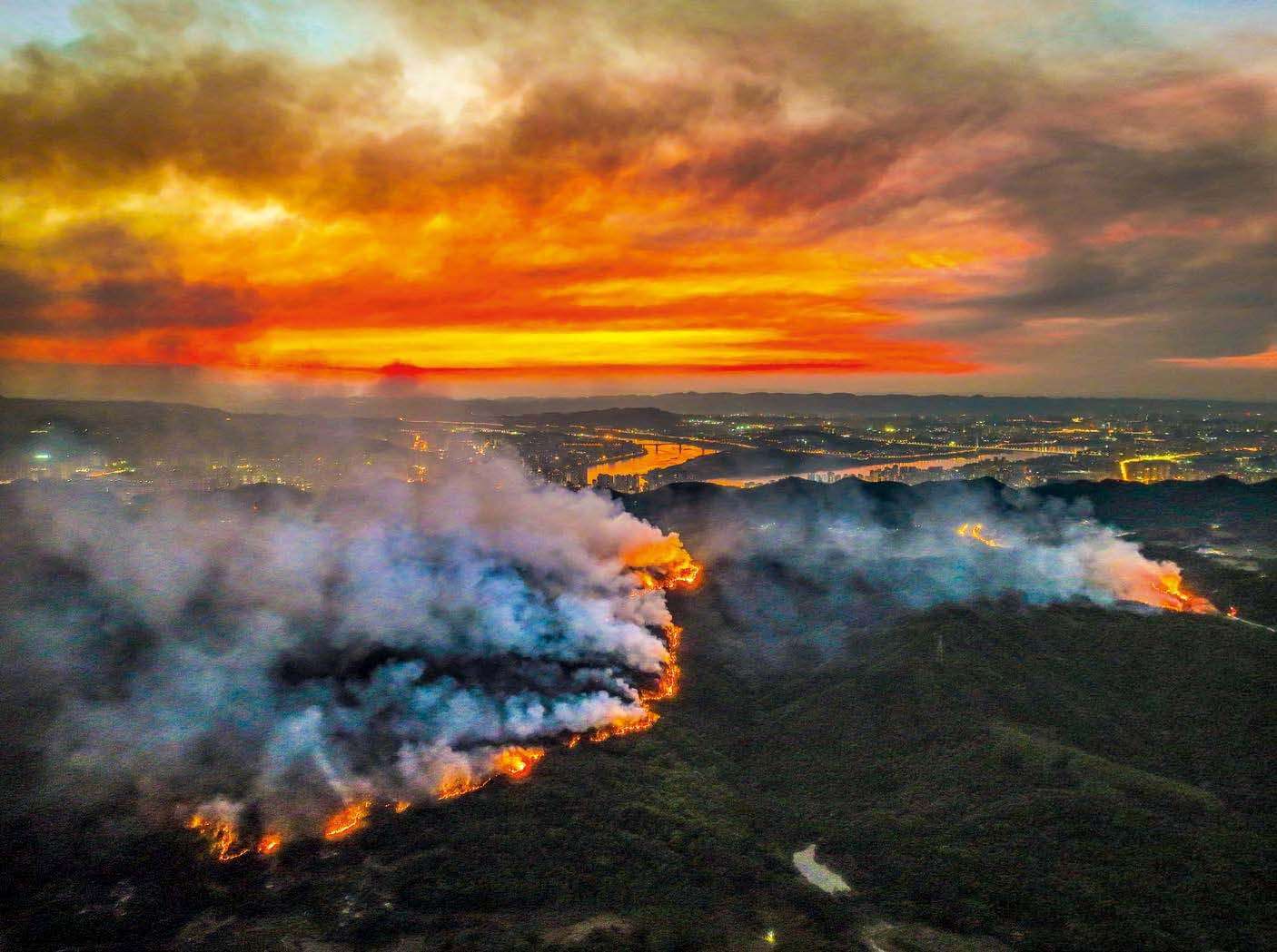 2022年夏,重庆持续高温引发山火。璧山、巴南、涪陵、江津、南川、大足、北碚、奉节、长寿这9个区县发生多起火灾。图为2022年8月22日拍摄的巴南区山火,救援队在历经86个小时的奋力扑救后,于2022年8月25日7时将巴南区明火彻底扑灭。