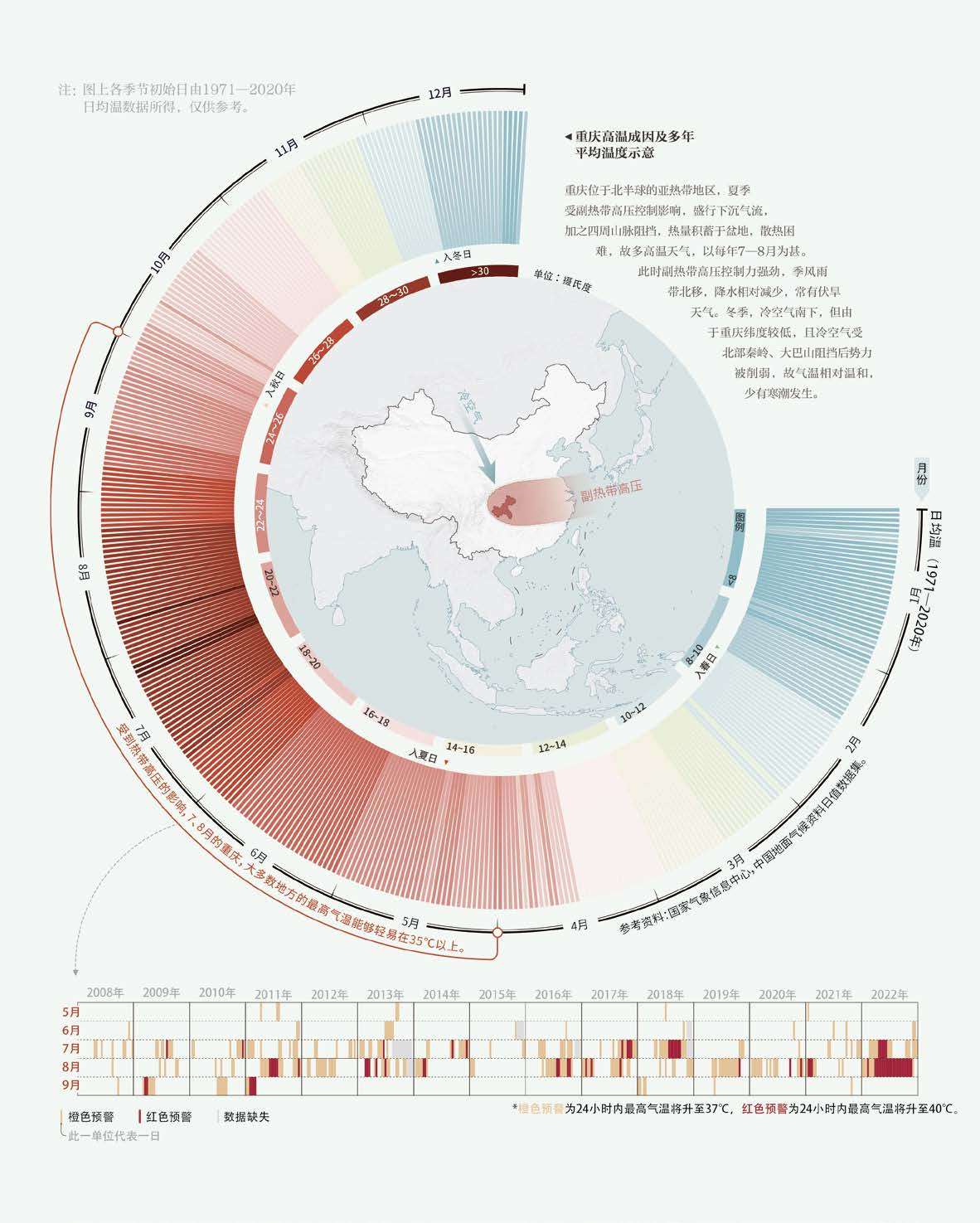 在阳光的炙烤下,除了海拔较高的山区,重庆大多数地方的气温轻易即可达到35℃,40℃以上的情况屡见不鲜。2022年夏,由于副热带高压异常“凶悍”,重庆许多地方连续半个多月最高温在40℃以上。合川城区有38天最高温在40℃以上,北碚区的最高气温甚至一度达到45℃。严重的高温伴随持续的干旱,给人们的生活带来巨大的困难与危险。