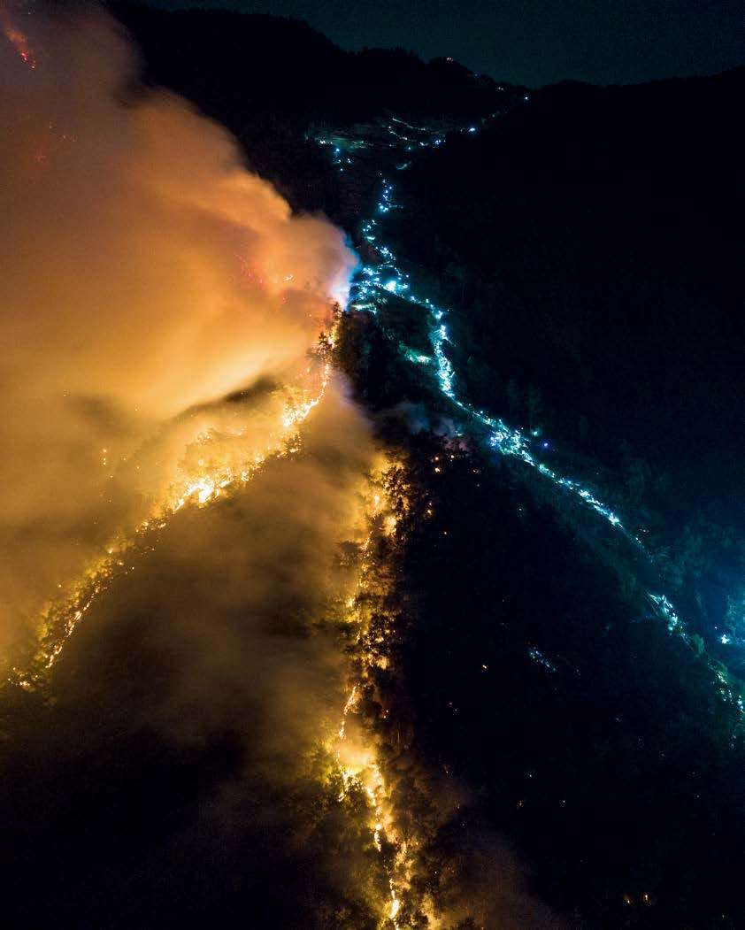 2022年8月25日,北碚区歇马街道的山火已经持续了4天,火势一路向北蔓延。摄影师用航拍的视角记录下了这动人的一幕:两条熊熊燃烧的“火龙”,与救援部队蓝色头灯组成的“光链”在夜幕中交错。