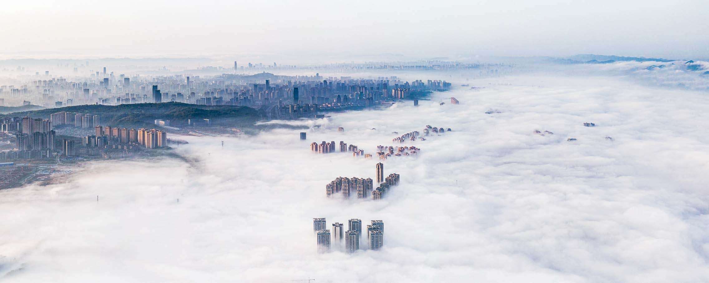 在稳定的风速条件下,当暖湿空气与较冷的地表“相遇”时,还会产生较为罕见的平流雾景观: 城市中的建筑、山丘被氤氲的水汽包 裹,宛若缥缈仙境,无怪乎人们将重庆称为“雾都”。