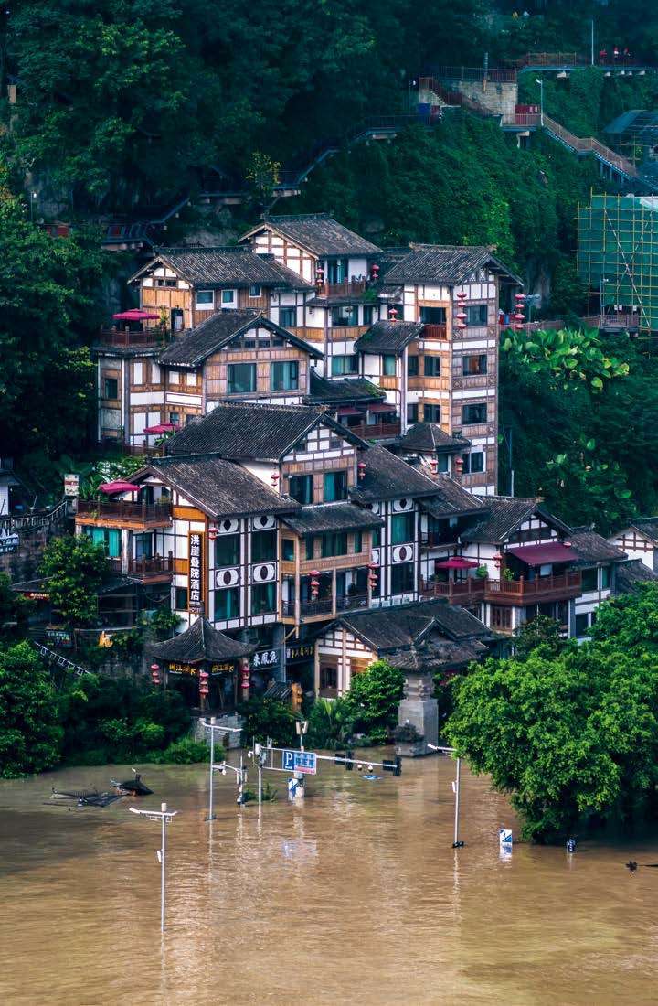 2020年8月18日至20日,“长江2020年第5号洪水”和“嘉陵江2020年第2号洪水”陆续过境重庆中心城区,造成长江、嘉陵江重庆段的水位大幅上涨。图片摄于2020年8月20日,图中洪崖洞景区的一楼和地下车库皆淹没于洪水之中。