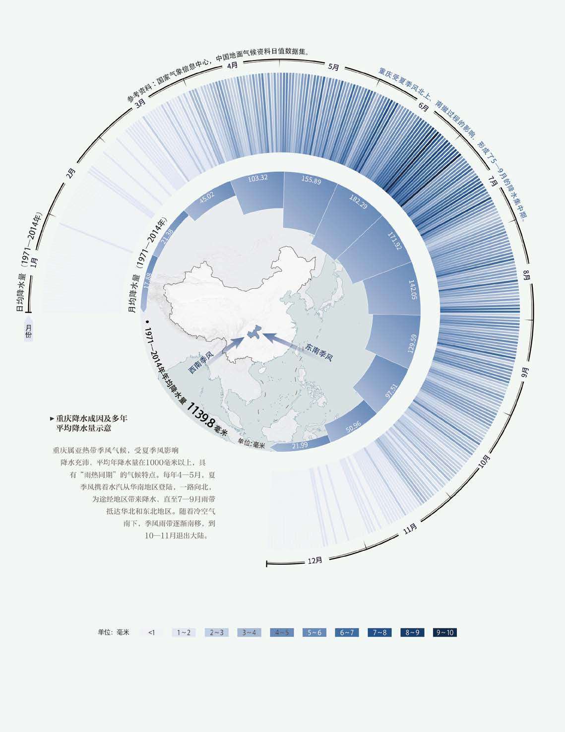 高空中的小水珠不断凝结,便会在重力作用下形成降水。重庆虽然深处我国西部内陆,但在东亚季风影响下,年降水量却能够达到1000毫米以上。每年5月至9月是重庆降水最为集中的时间,占全年降水量的六成至七成。