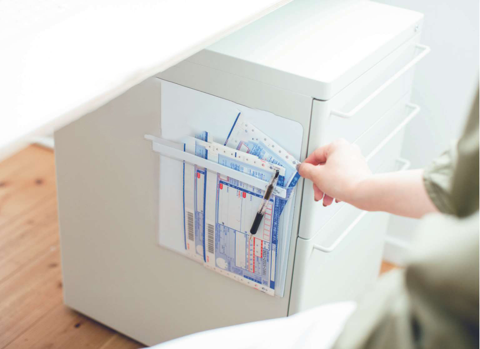 创业之前,我是一家邮购公司的收纳用品策划专员。“尺寸”是这类产品的关键,我经常要掏出尺子量一量。如果把常用的工具放在抽屉里,每次都得特地拉开抽屉去拿,用完了还得拉开抽屉再放回去,非常麻烦。想办法把它们放在抽屉外面,但又不能妨碍自己做其他工作,这才是提升工作效率的捷径。