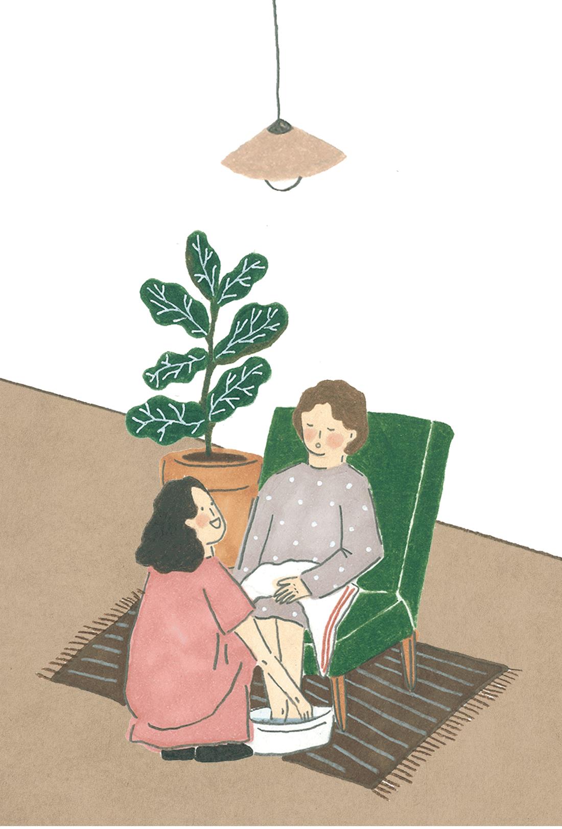 如果妈妈往后缩脚,我就会握得更紧,并对她说:“我小的时候,妈妈不也给我洗脚嘛。现在要进行的是伸展按摩。为了给妈妈服务,我可是认真学习了很久呢。”