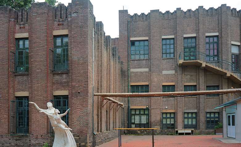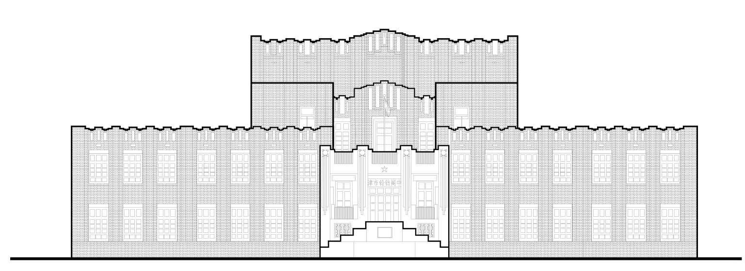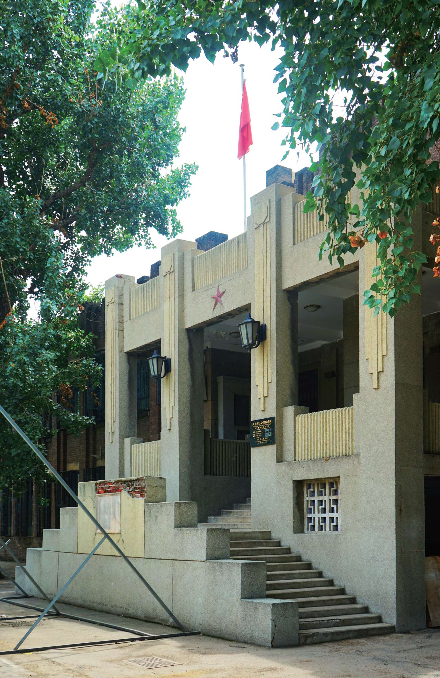 礼堂建于 1933 年,由阎子亨设计,为二层砖木混合结构楼房(局部三层)。建筑平面呈“丁”字形,前部二层均为教室,后部三层,首层是教室,二层和三层作为礼堂,室内装饰简洁。建筑外檐为青砖清水墙面,入口部分为混水饰面。立面采用壁柱等竖向元素,女儿墙上砌筑的花式雉堞,形成丰富轮廓线,是一座具有装饰艺术风格特征的建筑。1933 年 8 月22 日,《益世报》曾刊文称省立一中新礼堂“依世界最新之直角式绘样,单纯而美观”,表明阎子亨的设计风格受到当时世界流行的装饰艺术派(Art Deco)建筑风格的影响。