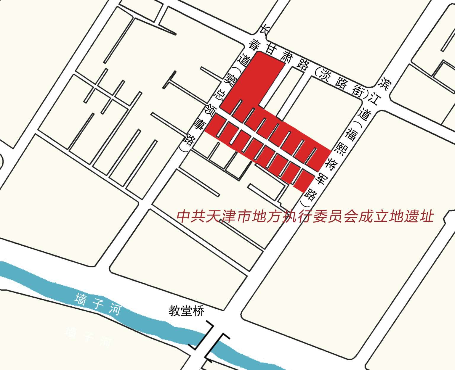 1924 年 9 月,天津全体共产党员在法租界 24 号路(今长春道)普爱里 21号(原 34 号)江浩家中举行中共天津地方执行委员会成立大会。江浩是中国共产党的早期党员和出色的革命家,毛泽东曾称赞他“是一位像松柏那样长青的革命元老”。早在 1911 年辛亥革命之时,江浩与李锡九就曾在天津建立同盟会北方支部,往来于京津之间,组织反清武装斗争。民国成立后,又以直隶省议员、国会议员等身份,在北方从事革命活动。1922 年前后,江浩大女儿江韵清进入直隶第一女子师范学校第一附属小学任体育老师。可以说,江浩对于天津的社会情况非常熟悉,有一定的社会关系,是天津的“老革命”。国民党第一次全国代表大会后,江浩从上海致信正在天津工作的女儿江韵清,让她在天津租一所小房子,最好在租界区,交通要方便,要有后门,便于秘密工作。根据父亲要求,经过一番挑选,江韵清最后选定法租界普爱里 21 号(原 34 号)。这栋小楼是一处里弄民居,一楼一院,前后两个门。里弄东面是新兴商业区,西面临近墙子河(今南京路),河对岸即是杂草丛生的老西开旷野,主弄道的南口是现在的滨江道,有绿牌电车通行,北口是今天的长春道,四通八达,一旦发生意外极易疏散。由于临近老西开教堂,又属教会房产,这一带的住户大多是天主教徒,江浩以参议员身份偕夫人刘玉莲和小女儿江汰清住在这里。人们都知道这里是参议院议员江浩的家,但实际上也是党在天津领导革命活动的战斗司令部。