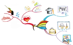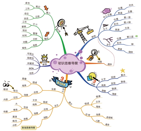 一张导图的内容,大到国际危机的处理,小到一件日常工作的计划,都离不了文字、图像和线条——它们虽然常见,却是一张思维导图最基本的三个元素。