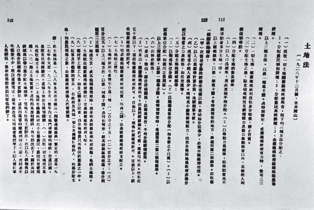 随着根据地逐步巩固,1928年 5 月至 7 月,湘赣边界各县掀起分田高潮,年底颁布井冈山《土地法》。广大贫苦农民从分得土地的事实中认识到红军是为他们的利益而奋斗的,从各方面全力支持红军和根据地发展。这是井冈山根据地能够存在和发展的社会基础。图为井冈山《土地法》。