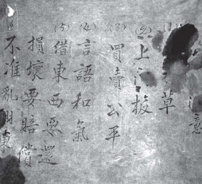 1928 年 4 月,毛泽东总结部队做政治工作的经验,规定部队必须执行“三大纪律、六项注意”,以后“六项注意”又发展成“八项注意”。图为红军战士的包袱皮,上面写着毛泽东制定的“三大纪律、六项注意”。