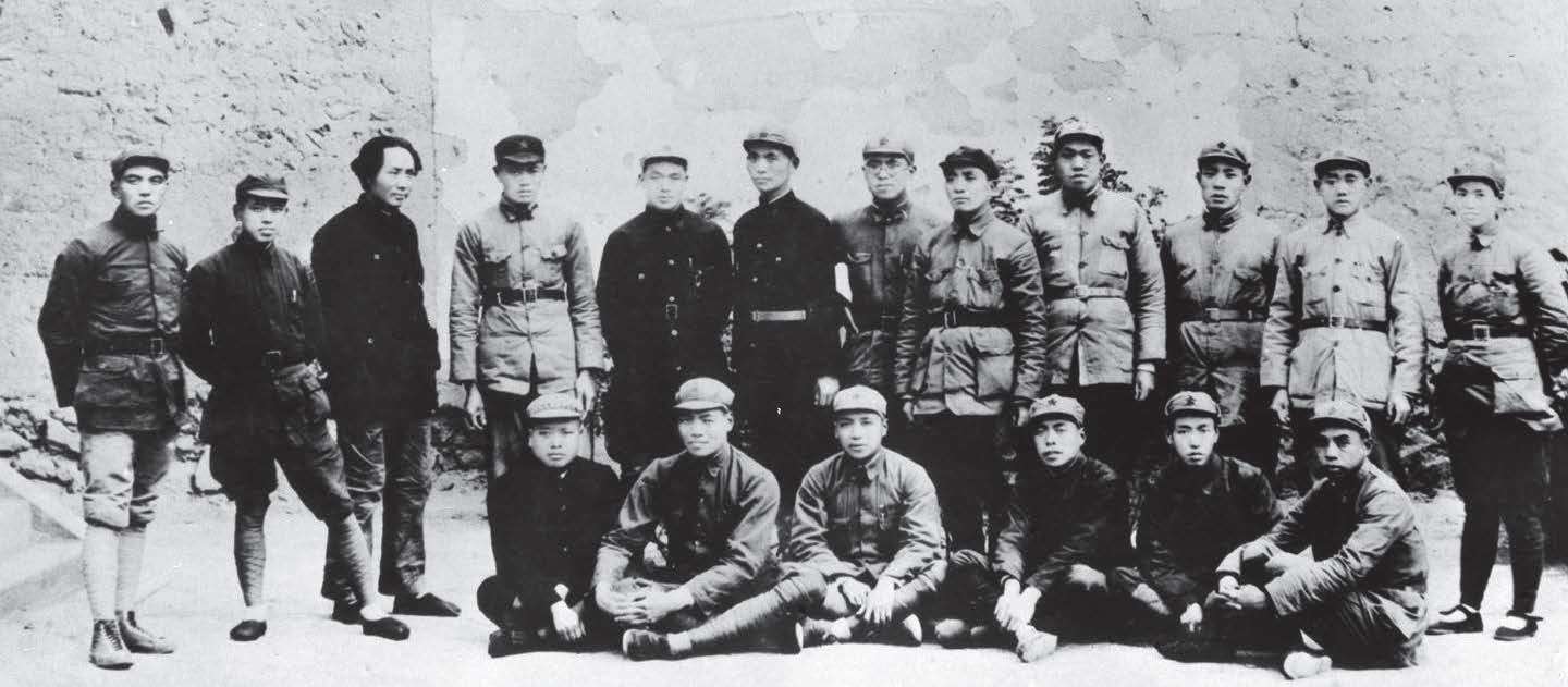 八七会议后,毛泽东以中央特派员身份到湖南传达八七会议精神、改组省委并领导秋收起义。以毛泽东为书记的中共湖南省委前敌委员会,将参加起义的各路武装 5000 余人统编为工农革命军第一师,于 1927 年 9 月 9 日发动湘赣边界秋收起义。在攻打中心城市长沙受挫后,毛泽东果断改变计划,率部队退到浏阳文家市集中,主持召开前委会议,决定到敌人统治力量薄弱的农村山区寻找落脚点。从进攻大城市转到向农村进军,这是中国人民革命发展史上具有决定意义的新起点。图为参加秋收起义的部分同志 1937 年在延安合影,左三为毛泽东。