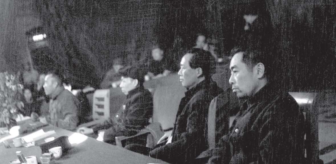 1945 年 6 月 19 日,七届一中全会选出 13 名中央政治局委员,选举毛泽东、朱德、刘少奇、周恩来、任弼时为中央书记处书记,毛泽东为中央委员会主席、中央政治局主席、中央书记处主席。8 月,中央政治局会议决定毛泽东为中央军事委员会主席,朱德等为副主席。这就使全党在组织上达到了空前的团结和统一。图为周恩来、毛泽东、刘少奇、朱德在大会主席台上(前排右起)。