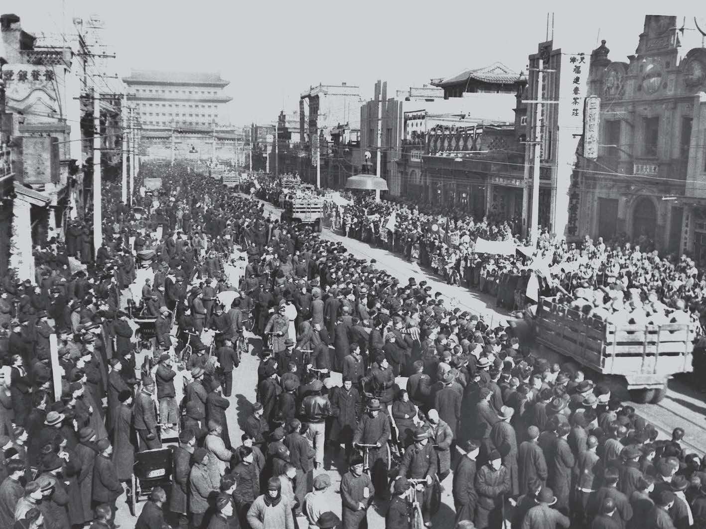 1949 年 1 月,北平已在人民解放军严密包围下,傅作义率北平国民党守军 20 余万人,接受和平改编,北平和平解放。图为 1949 年 1 月 31 日,人民解放军举行北平入城式,在万众欢呼中进入前门大街。