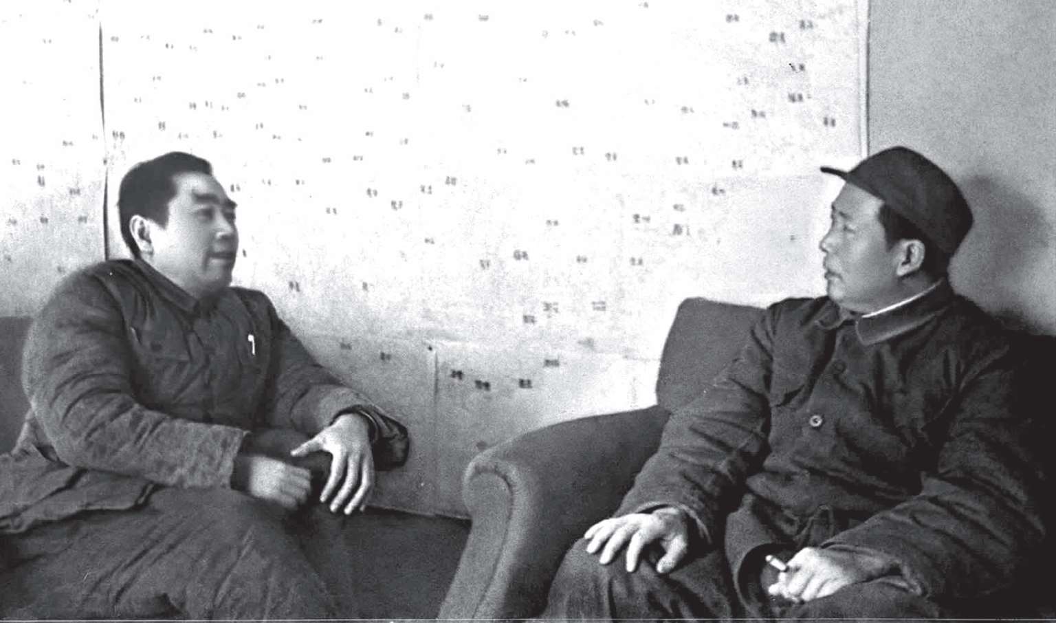 1948 年 9 月至次年 1 月,人民解放军与国民党军队展开战略决战,周恩来、朱德协助毛泽东在西柏坡指挥作战。图为毛泽东和周恩来在西柏坡。
