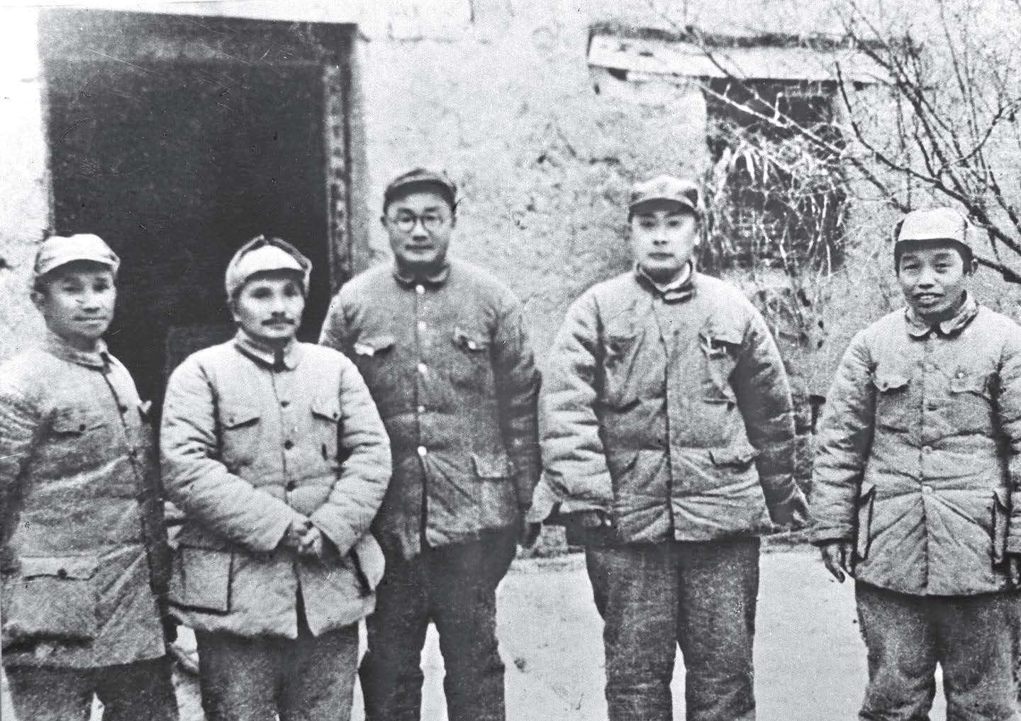 辽沈战役刚结束,华东野战军和中原野战军及部分地方武装共 60 余万人,在以徐州为中心,东起海州、西至商丘、北起临城(今薛城)、南达淮河的地区,发起规模空前的淮海战役。1948 年 11 月 16 日,党中央决定由刘伯承、陈毅、邓小平、粟裕、谭震林组成以邓小平为书记的总前委,统一指挥华东野战军和中原野战军。图中左起:粟裕、邓小平、刘伯承、陈毅、谭震林。