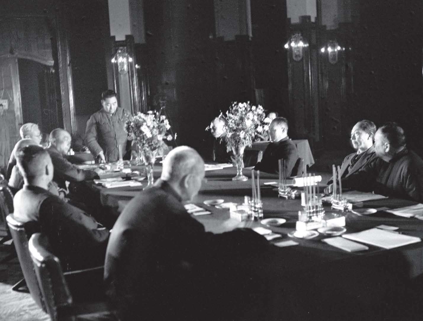 1949 年 4 月,中国共产党代表团与南京国民党政府代表团在北平举行谈判。经过反复磋商,4月15日,中共代表团提出《国内和平协定》(最后修正案),限国民党政府在 4 月 20日前表明态度。由于国民党政府拒绝在这个协定上签字,谈判宣告破裂。图为我方首席代表周恩来在中南海勤政殿举行的谈判会上讲话。
