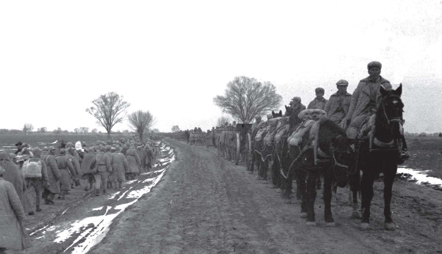 1948 年冬,淮海战役战场,解放军凯歌前进,国民党军俘虏被押送后方。