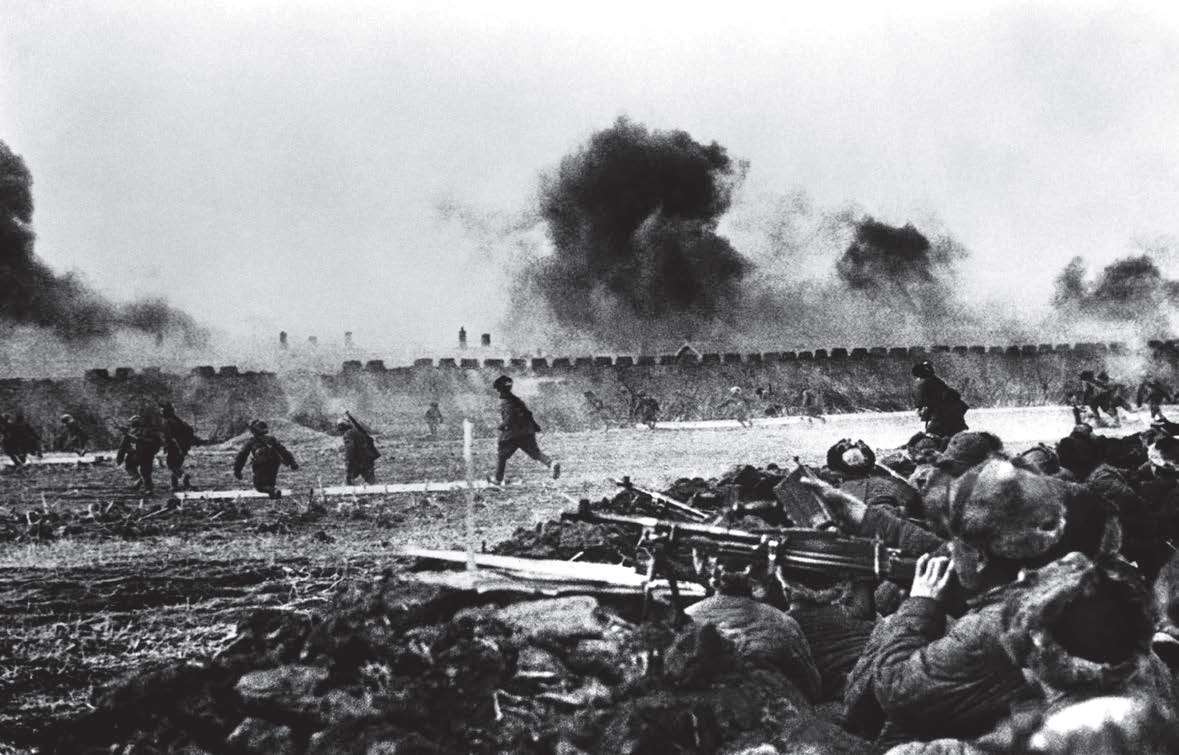 1948 年 9 月 12 日,东北野战军主力和地方武装 103 万人发起辽沈战役,向被分割在锦州、长春、沈阳等孤立地区的 55 万国民党军发动进攻。战役首先从攻打锦州、封闭国民党军于东北开始。10 月 14 日,东北野战军对锦州发起总攻,经过 31小时激战,全歼守敌近 9 万人。东北野战军攻占锦州后,立即合围并全歼沈阳出援锦州的国民党军廖耀湘兵团,随后乘胜追击,于 11 月 2 日解放沈阳、营口。东北全境解放。图为解放军强攻锦州。