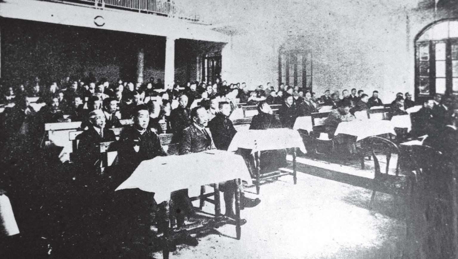 1924 年 1 月,中国国民党第一次全国代表大会在广州举行。国民党一大审议通过《中国国民党第一次全国代表大会宣言》,对三民主义作出新解释,即“新三民主义”。在民族主义中突出反对帝国主义的内容,民权主义中强调民主权利应为“一般平民所共有”,民生主义则以“平均地权”“节制资本”为两大原则。国民党一大事实上确立了联俄、联共、扶助农工的三大革命政策,标志着第一次国共合作正式形成。图为国民党一大会场。