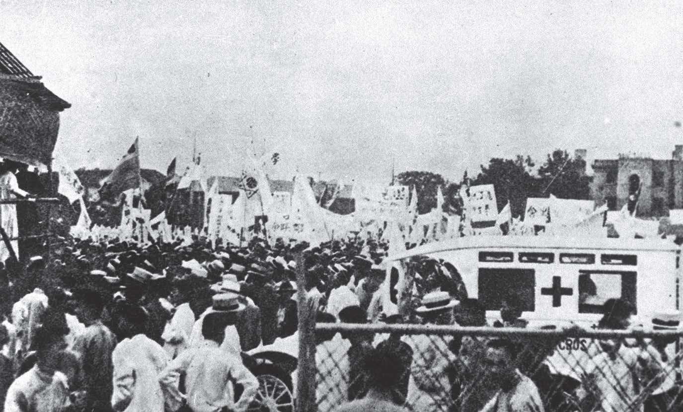 1925 年 5 月 15 日,上海内外棉七厂日本资本家枪杀工人、共产党员顾正红。30 日,在中国共产党领导和发动下,上海工人和学生举行街头宣传和示威游行,租界英国巡捕在南京路上突然开枪,打死学生、工人等 13 人,伤者不计其数。这就是震惊全国的五卅惨案。图为 1925 年上海市民大会演讲台之侧面。