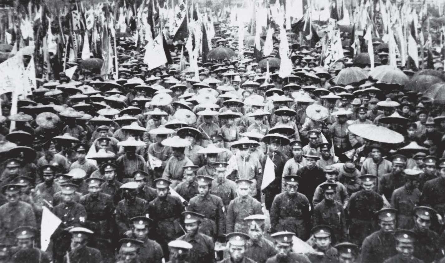 以五卅惨案为导火线,反对帝国主义的民族运动浪潮,以不可遏止的浩大声势迅速席卷全国,这就是五卅运动。党中央决定成立上海总工会,成立上海工商学联合会,加强对运动的领导。图为五卅运动爆发时上海总工会的游行队伍。