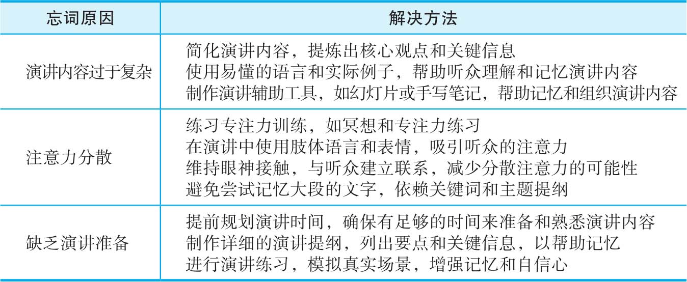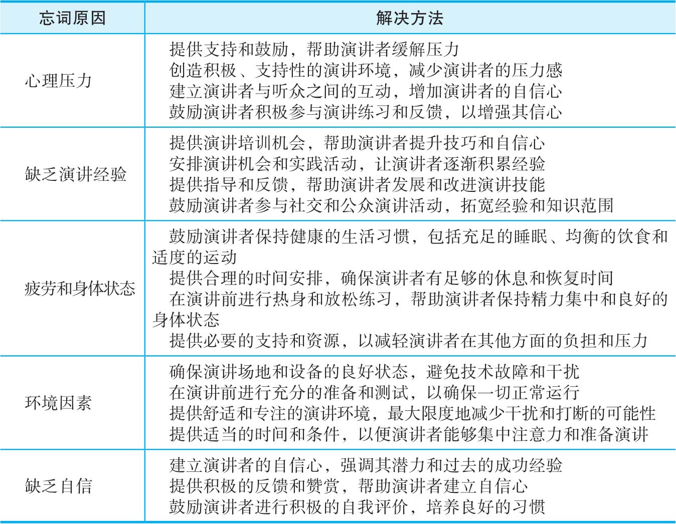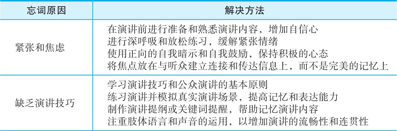 请注意,虽然人工智能可以提供辅助和支持,但在克服忘词问题方面,个人的努力、实践和经验积累仍然是至关重要的。人们应根据自身情况和需求,灵活选择并结合不同的解决方法和AI工具来提升演讲技巧和应对忘词的能力。
