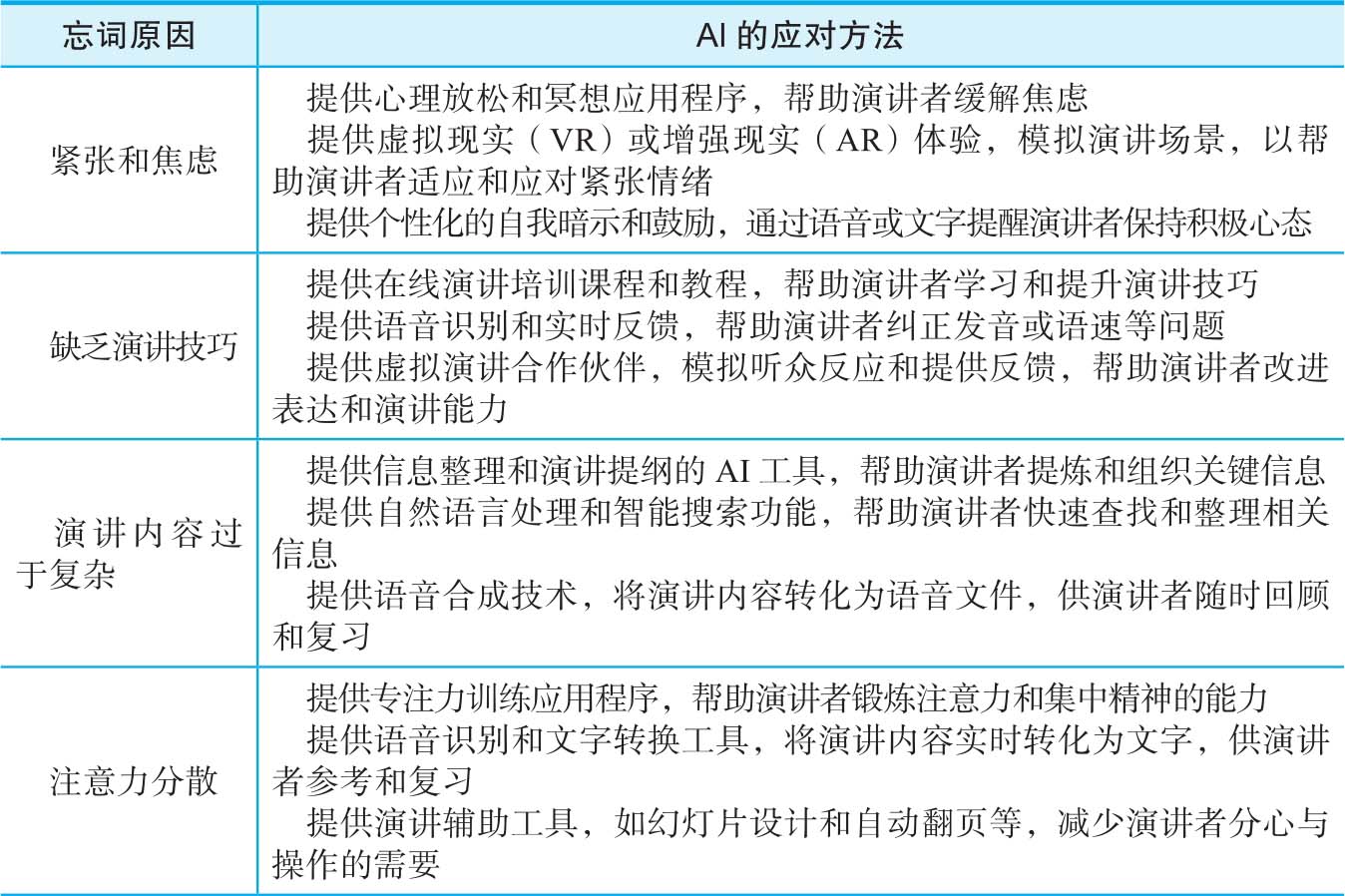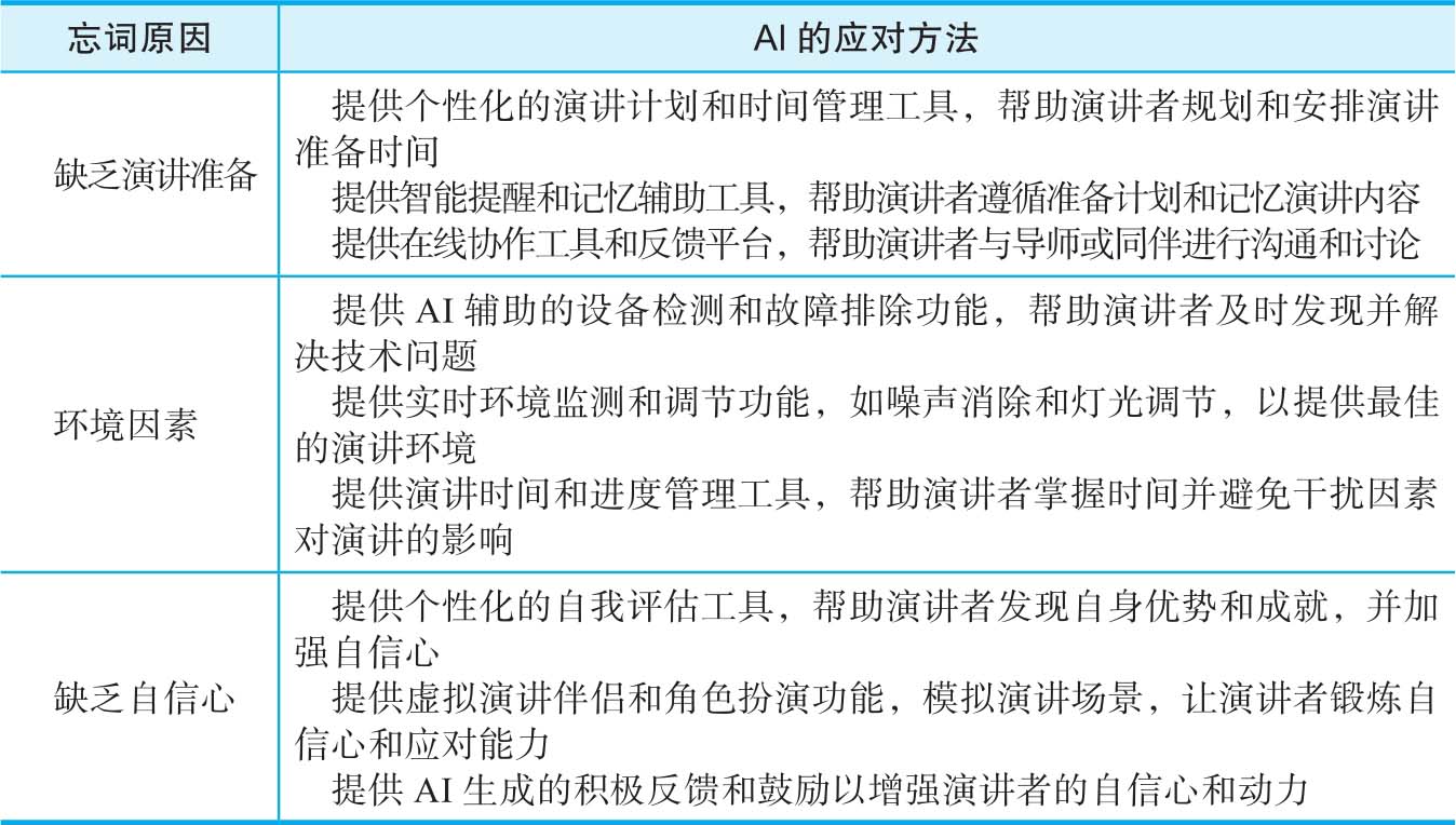 针对以上原因,AI可以从哪些方面帮助我们应对这些问题,减少忘词呢?也请用表格列出。