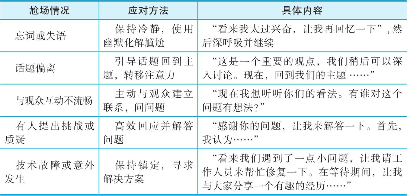 当面对演讲互动中可能出现的“尬场”情况时,作为一名专业的演讲教练,可以采取以下方法来应对。下面是一张表格,其中列出了常见的“尬场”情况和相应的应对方法: